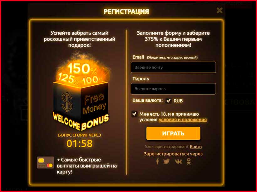 К созданию аккаунта допускаются только совершеннолетние пользователи. Вся процедура занимает не больше минуты. Игроку нужно выбрать один из двух вариантов регистрации. Создать профиль можно с помощью своей страницы в соцсетях или после заполнения стандартной регистрационной формы. Во втором случае гемблеру необходимо прописать свой электронный адрес и указать надежный пароль. Далее потребуется согласиться с условиями онлайн-казино и нажать по кнопке «Играть».