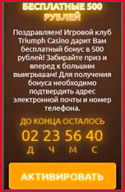 Онлайн-казино Триумф предлагает всем новым пользователям бездепозитный бонус в размере 500 рублей. Щедрый приз, вручаемый виртуальным клубом, позволяет игрокам делать первые ставки без предварительного взноса. Кроме того, имея на своем балансе бездепозитный бонус, гемблер сможет быстрее ознакомиться с функционалом онлайн-платформы, оценить ее основные плюсы и минусы. У игрока также будет возможность выиграть солидные призы, не рискуя личными деньгами. Получить бездепозитный бонус могут только участники онлайн клуба.